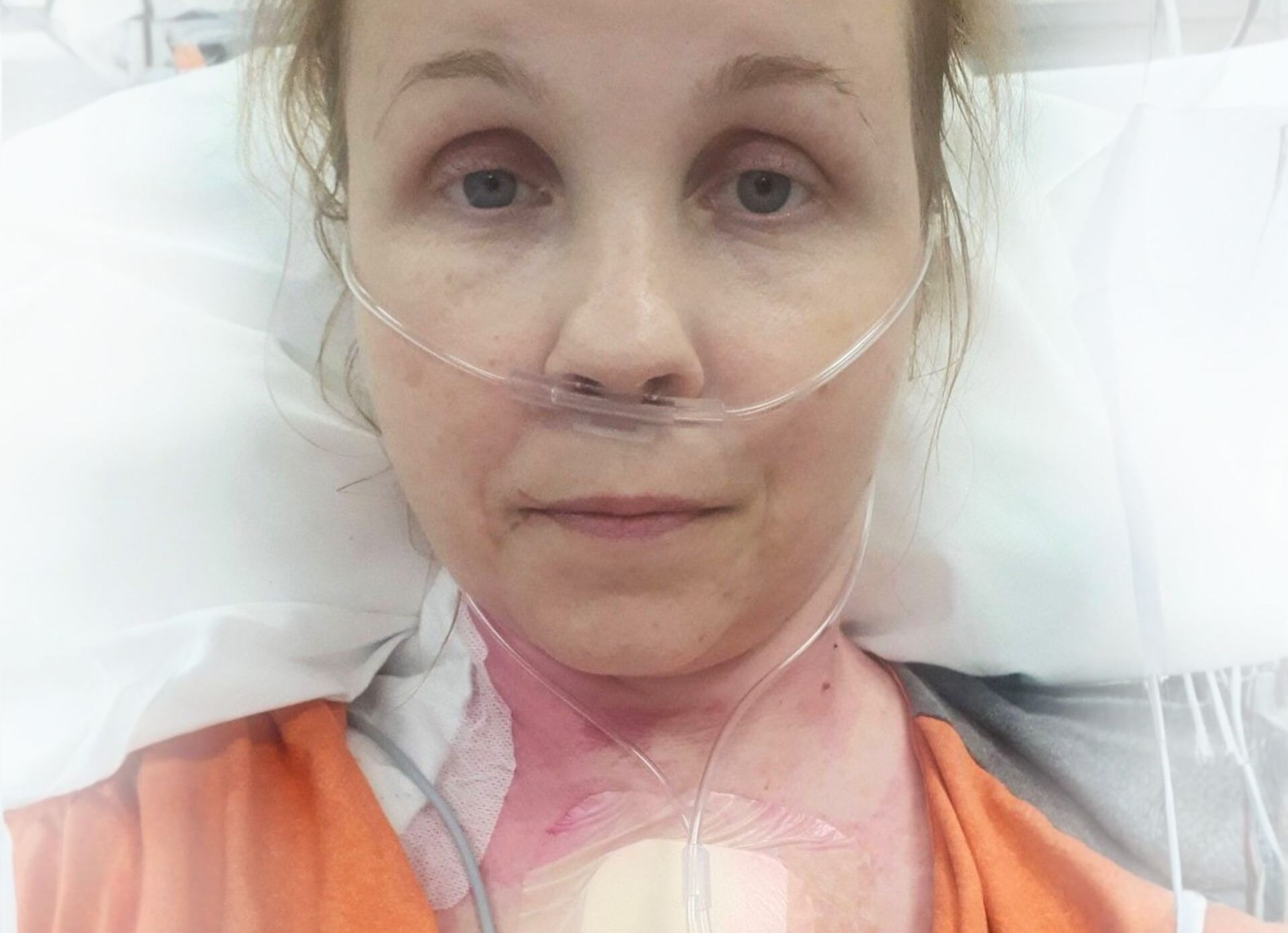 Katri yritti pysyä rohkeana kuvassa, jonka lähetti sairaalasta perheelleen. Kuva: Katrin kotialbumi.
