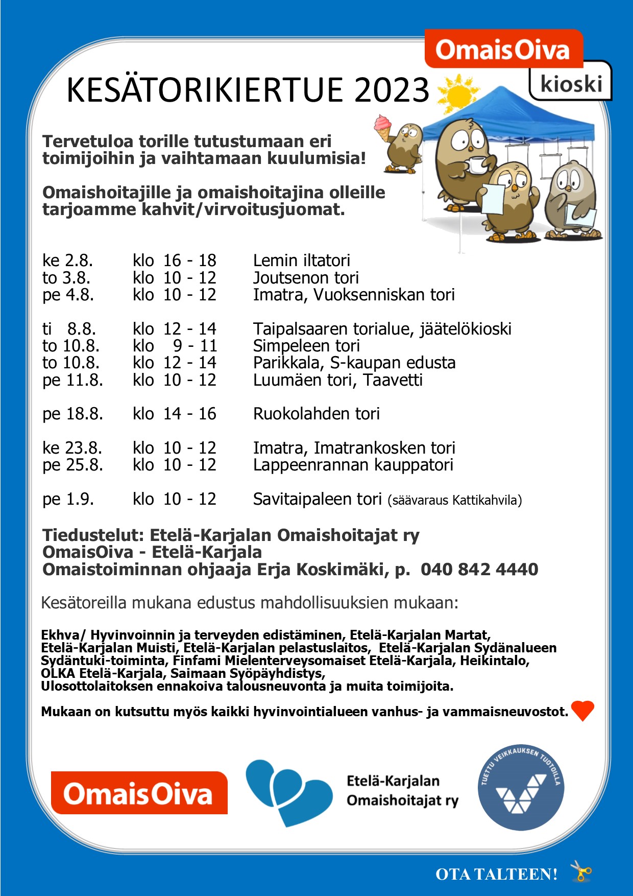 Etelä-Karjalan Omaishoitajat ry koordinoima kesätorikiertue alkaa tämän viikon keskiviikkona. Kiertue käy kuukauden aikana Etelä-Karjalan kunnissa ja tuolloin on tavattavissa järjestöjen ja eri toimijoiden edustajia.