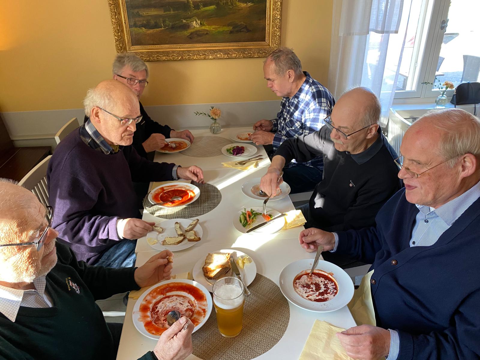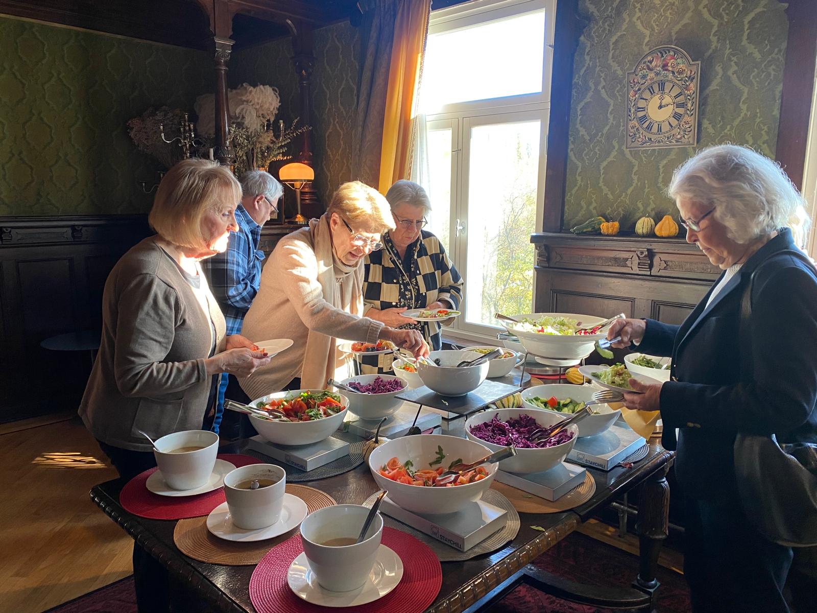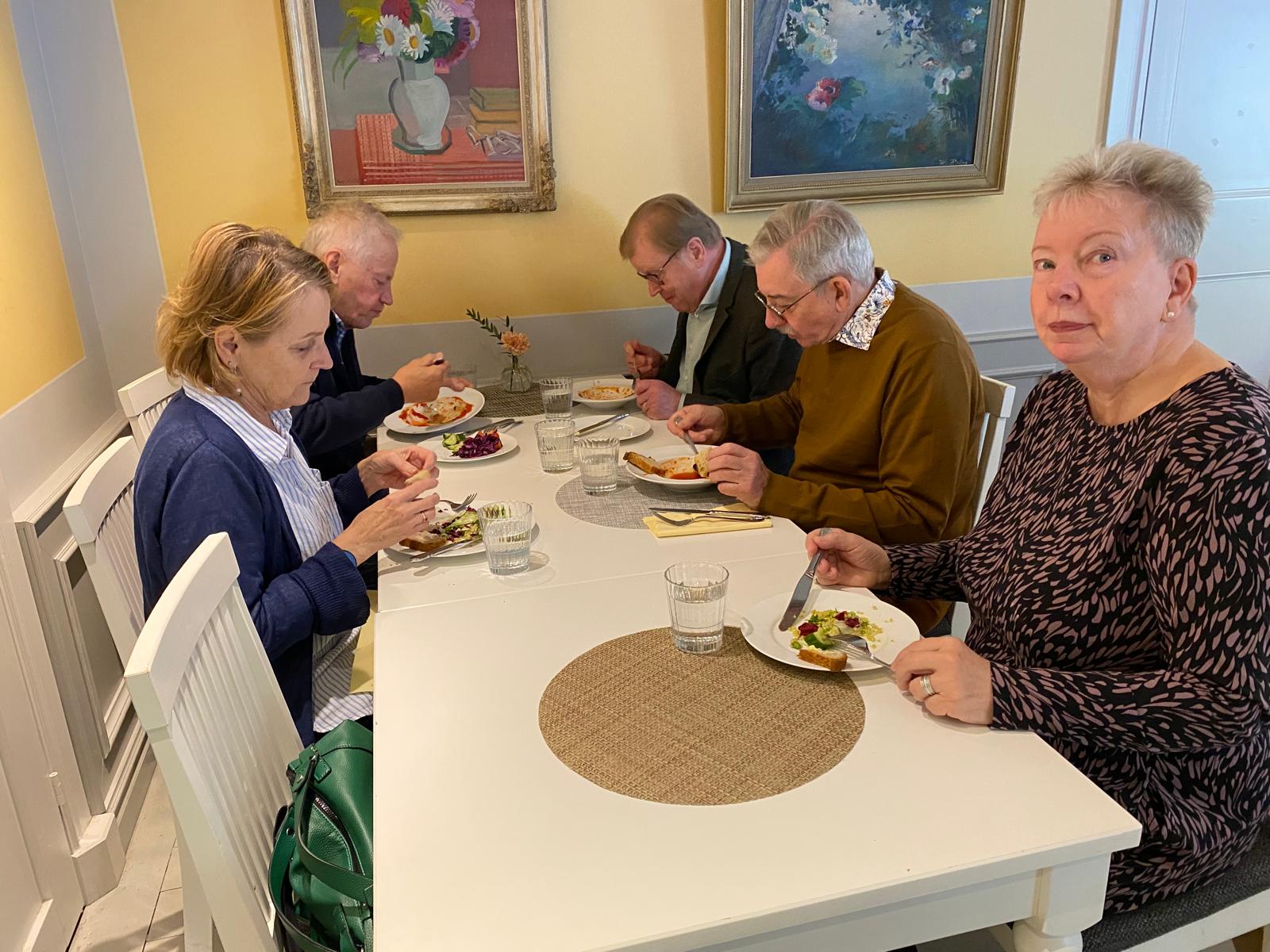 Aloitimme lounaan lämpimällä bortskeitolla ja nautimme salaattipöydän runsaista vaihtoehdoista. Pääruoaksi oli tarjolla monenmoista ja jokaiselle löytyi mieluista ja maukasta syötävää. Jälkiruokaa ja kahvia nautimme innokkaan puheensorinan säestämänä.