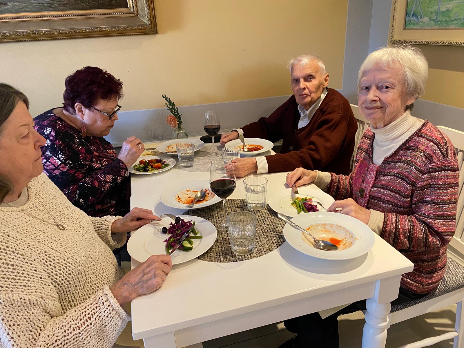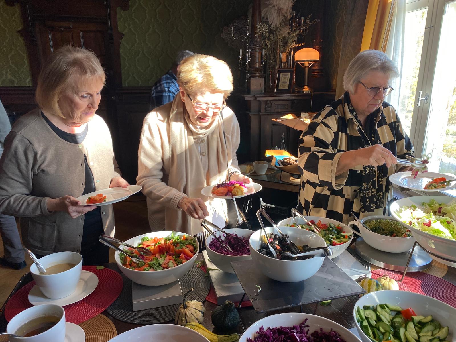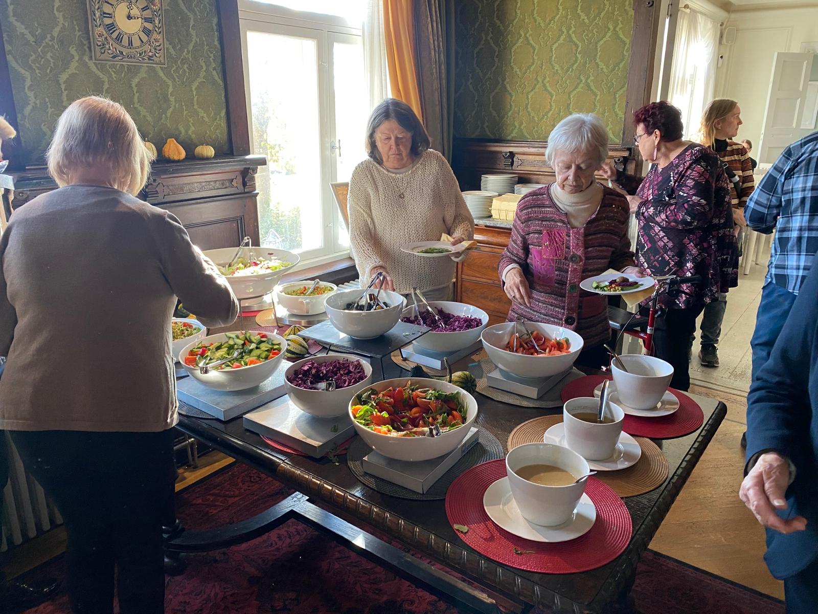 Aloitimme lounaan lämpimällä bortskeitolla ja nautimme salaattipöydän runsaista vaihtoehdoista. Pääruoaksi oli tarjolla monenmoista ja jokaiselle löytyi mieluista ja maukasta syötävää. Jälkiruokaa ja kahvia nautimme innokkaan puheensorinan säestämänä.