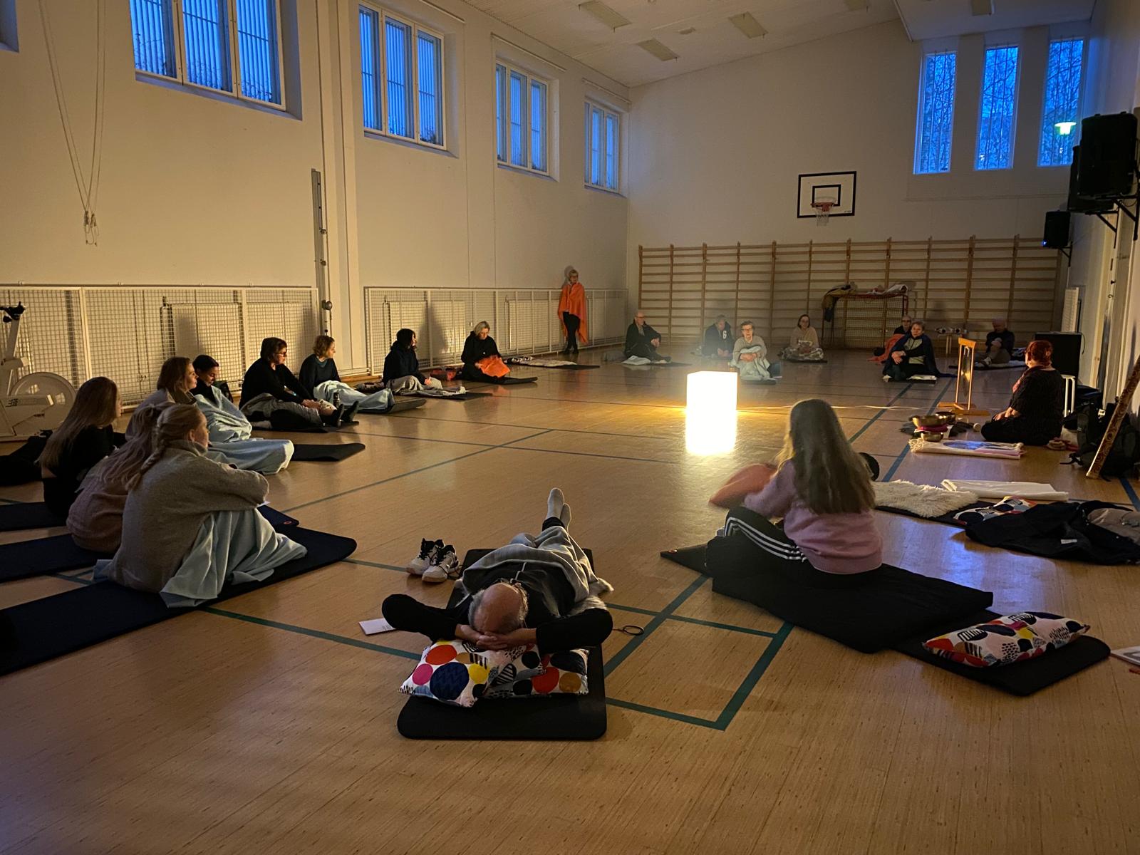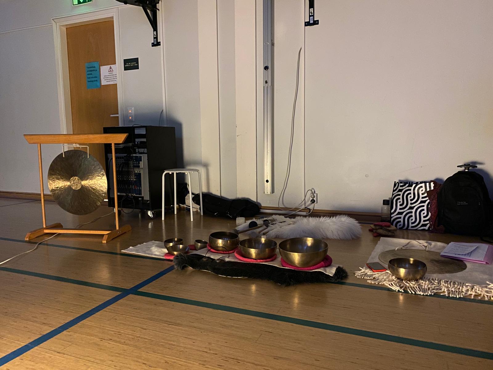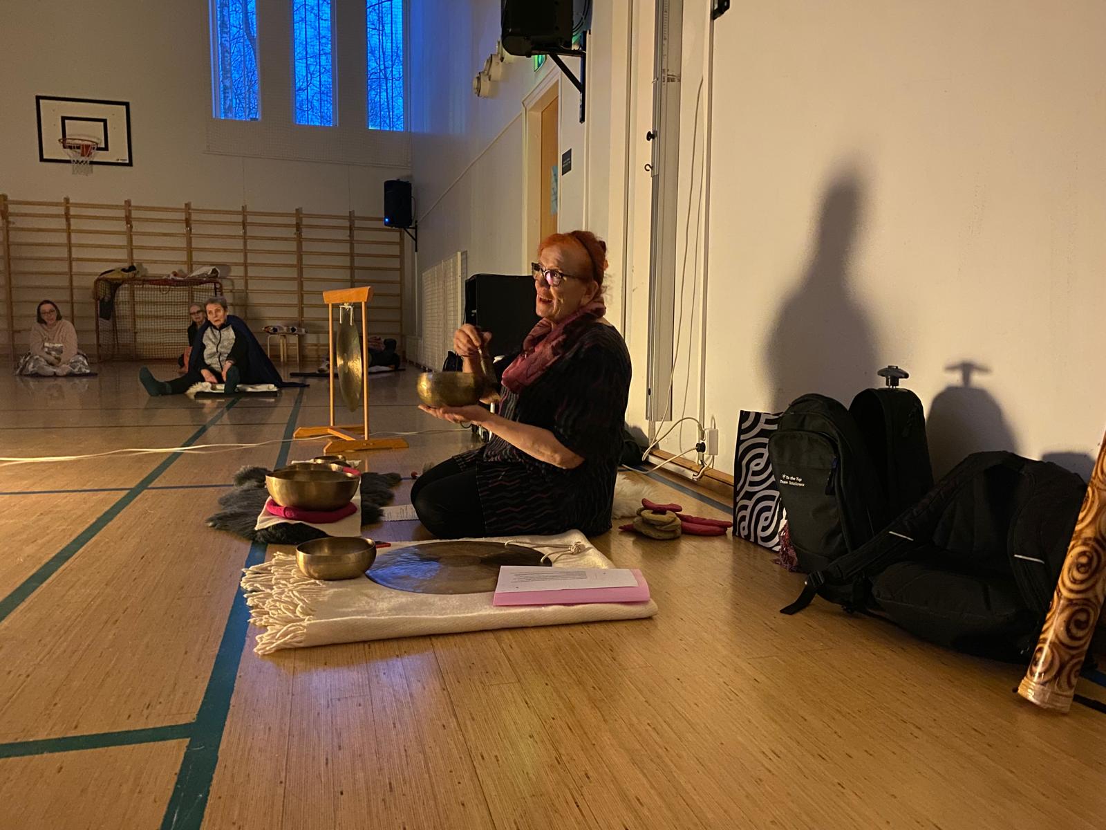 Saimme nauttia rentouttavasta sointukylvystä Vappu Laineen johdolla. Asetuimme lattialle filttien alle makaamaan puolikaaren muotoon ja annoimme sointujen viedä mennessään. Äänivärähtelyt soljuivat ilmoille lempeästi ja nautimme jokaisesta hetkestä.