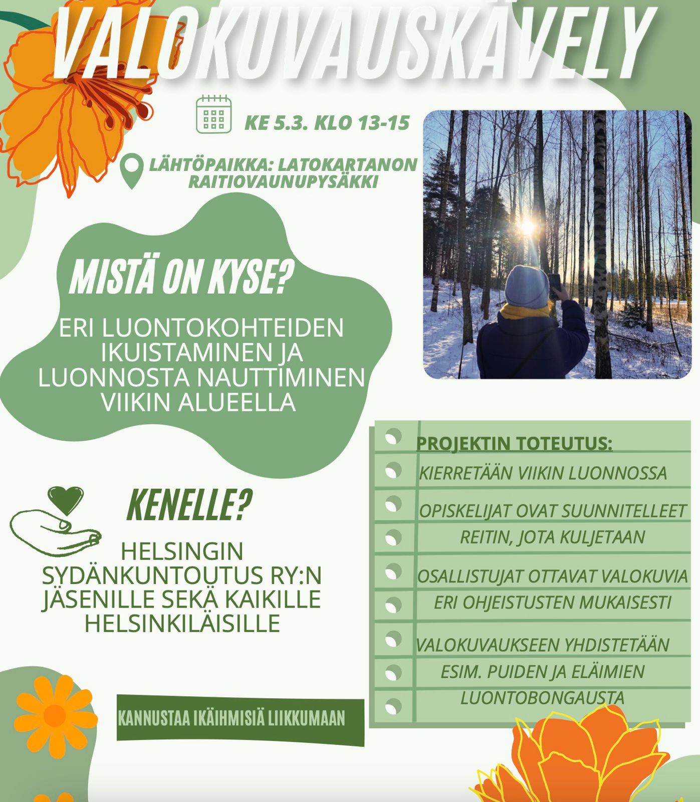Valokuvauskävelyn meille olivat suunnitelleet Metropolian opiskelijat. Kävelyn ideana oli luontokohteiden ikuistaminen eri ohjeistuksen mukaisesti ja luonnosta nauttiminen Viikin alueella opiskelijoiden suunnittelemalla reitillä. Valokuvaukseen yhdistettiin eläinten ja puiden bongauksia. Keskiviikoksi sattui sateinen harmaa keli, mutta eipä se tahtia haitannut. Saimme upeita luontokuvia ikuistettua ja hyvää mieltä yhdessä kävellen.