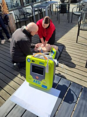 Pohjois-Karjalan Sydänpiiriltä sairaanhoitaja Salla Orozco opastaa sydäniskurin käyttöä Pivangalla.
