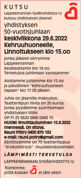 Tervetuloa juhlimaan kanssamme yhdistyksen 50-vuotista taivalta keskiviikkona 29.6.2022 Kehruuhuoneelle, Linnoitukseen klo 15.00, jonka jälkeen halukkaat siirtyvät Lappeenrannan Kesäteatteriin klo 19.00 katsomaan ”Krokotiilirock” -musiikkinäytelmää.