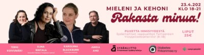 Kulttuuri-ilta: Mieleni ja kehoni – RAKASTA MINUA! 23.4.2025 Tampereen Ylioppilasteatterilla. Lue lisää Tapahtumakalenterista ja lunasta lippusi Lippuagentti.fi verkkokaupasta!