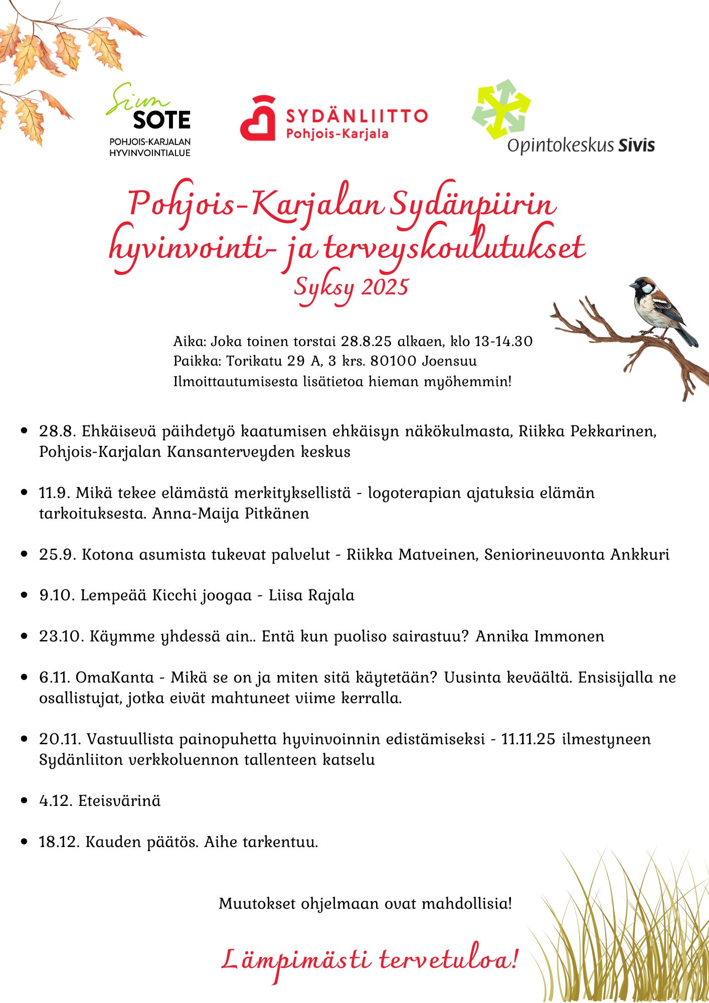 Koulutusten sisällöt ovat suunnattu erityisesti sydänsairastuneille ja heidän läheisilleen, mutta kaikki käsiteltävistä teemoista kiinnostuneet ovat lämpimästi tervetulleita osallistumaan. Tilojen rajallisuuden vuoksi osallistujamäärämaksimi on 25 henkilö
