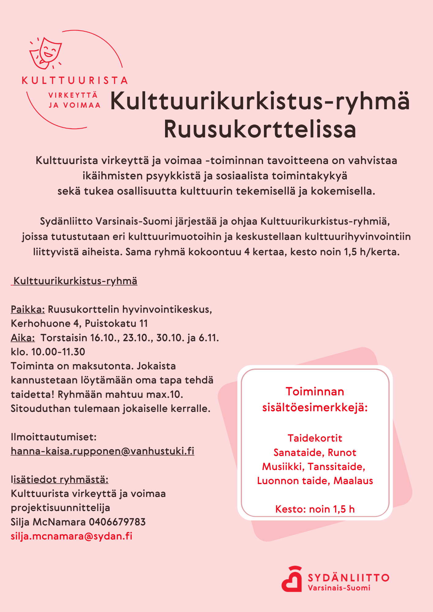 Mukaan mahtuu 10 osallistujaa, ilmoittautumiset: hanna-kaisa.rupponen@vanhustuki.fi