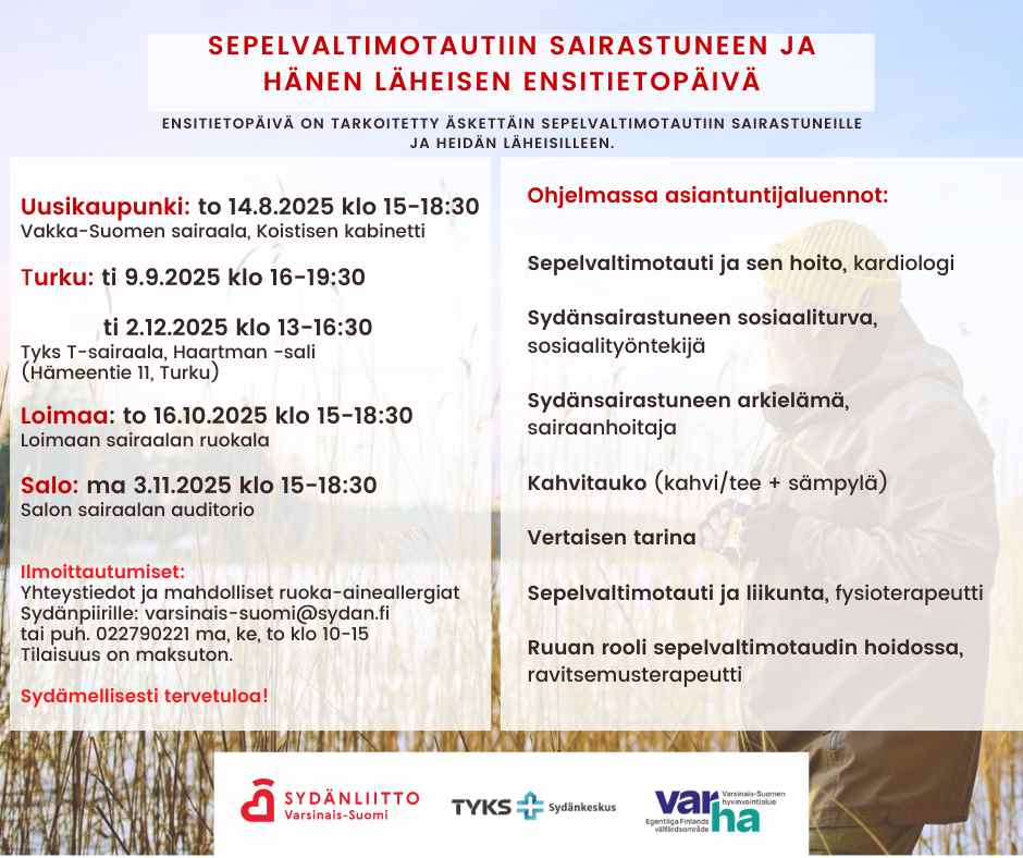 Ensitietopäivä on tarkoitettu äskettäin sepelvaltimotautiin sairastuneille ja heidän läheisilleen. Tilaisuus on maksuton ja sisältää kahvitarjoilun. Sydämellisesti tervetuloa!