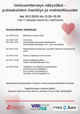 Koulutuksiin ovat tervetulleita kaikki sydänsairastuneiden parissa työskentelevät ammattilaiset joko paikan päällä Tyks Sydänkeskuksessa tai etänä Teamsin kautta. Linkin Sydäntreffeille saat sähköpostitse, reea.vanhatalo@sydan.fi. Voit ilmoittautua treffeille myös Varhan koulutuskalenterin kautta.