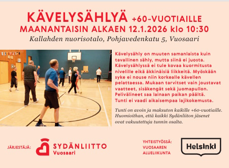 Kävelysähly jatkuu maanantaina 12.01.2026 klo 10:30 Kävelysähly on muuten samanlaista kuin tavallinen sähly, mutta siinä ei saa juosta. Kävelysählyssä ei tule kovaa kuormitusta nivelille eikä äkkinäisiä liikkeitä. Myöskään syke ei nouse niin korkealle kävellen pelatessa. Mukaan tarvitset vain joustavat vaatteet, sisäpelikengät sekä juomapullon. Pelivälineet saat lainaan paikan päältä. Tunti ei vaadi aikaisempaa kokemusta. Tunti on avoin ja maksuton kaikille +60 -vuotiaille. Huomioithan että kaikki Sydänliiton jäsenet ovat vakuutettuja tunnin osalta.