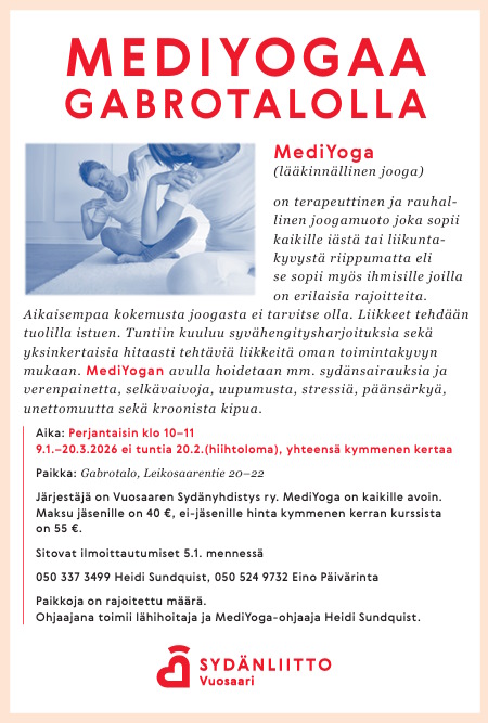Mediyoga Gabrotalolla Perjantaisin klo 10-11. Leikosaarenkatu 20-22 Sitovat ilmoittautumiset 5.1.2026mennessä. 050337 337 3499 Heidi Sundquist, 0505249732 Eino Päivärinta Paikkoja rajoitettu määrä.
