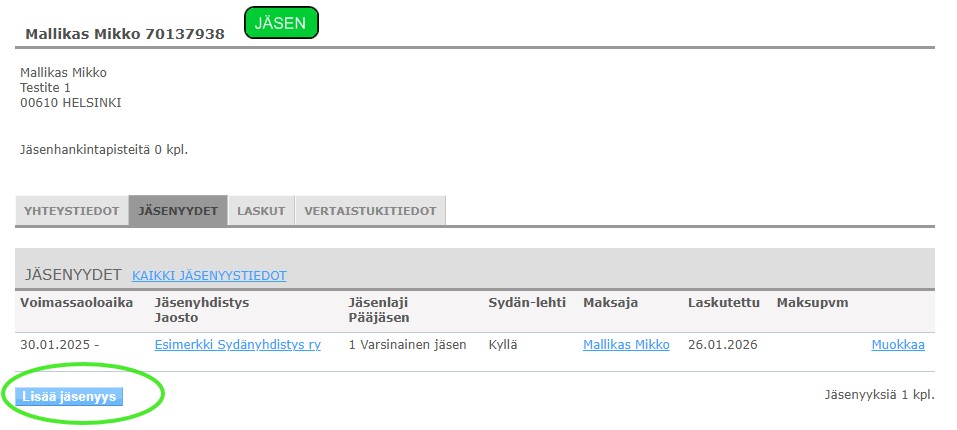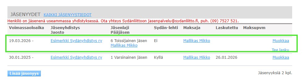 Toissijainen jäsenyys ilmestyy Jäsenyydet-välilehdelle punaisen huomiotekstin kera. Jos jäsenyyden luominen onnistui, ei ole tarpeen ilmoittaa enää erikseen jäsenpalveluun asiasta.
