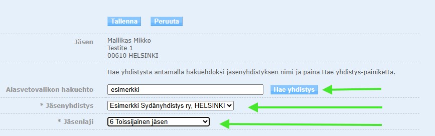 Kirjoita osa yhdistyksen nimestä ja paina Hae yhdistys -nappia. Valitse yhdistys pudotusvalikosta kohtaan Jäsenyhdistys. Kun tämä on valittu, tulee mahdolliseksi valita Jäsenlaji eli toissijainen jäsen.