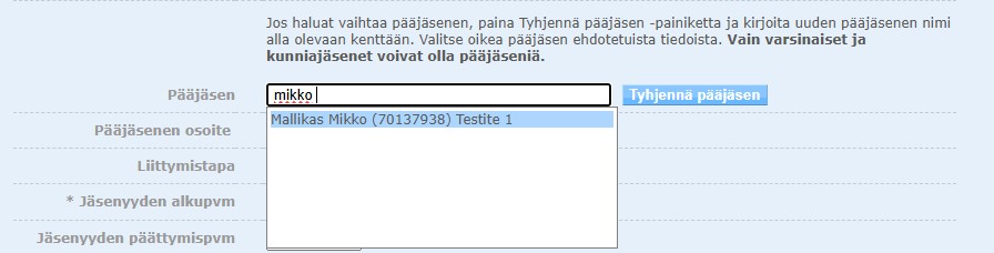 Etene pääjäsenen asettamiseen. Kirjoita Pääjäsen-kenttään jäsenen nimi tai sen osa ja odota pari sekuntia. Kilta tuottaa listan nimistä ilman, että mitään nappia pitää painaa. Toissijaisissa jäsenyyksissä jäsen on siis oma pääjäsenensä.