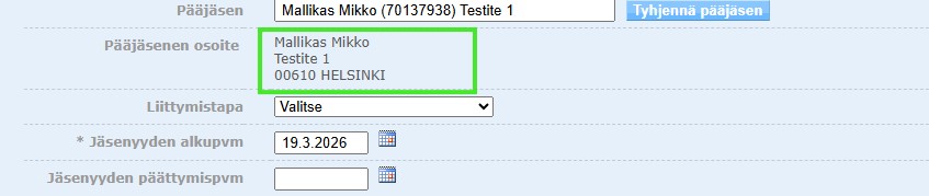 Valitse listasta jäsen. Kilta tuo välittömästi jäsenen osoitetiedot tekstiksi kohtaan Pääjäsenen osoite. Tarkista tiedot ja paina Tallenna.