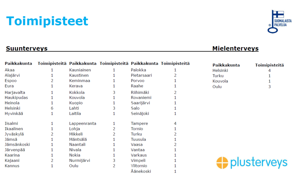 - Mielenterveyspalvelut PlusTerveys Tunteen toimipisteiltä: lyhytterapiakäynnit, ADHD-palvelu ja psykiatrin vastaanotto: ensimmäinen käynti ilman palvelumaksua, myös etävastaanotot.